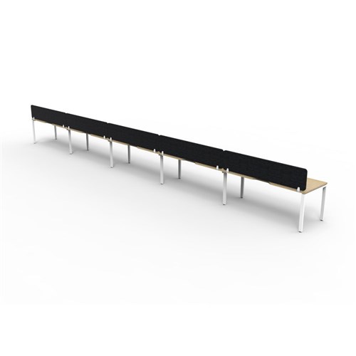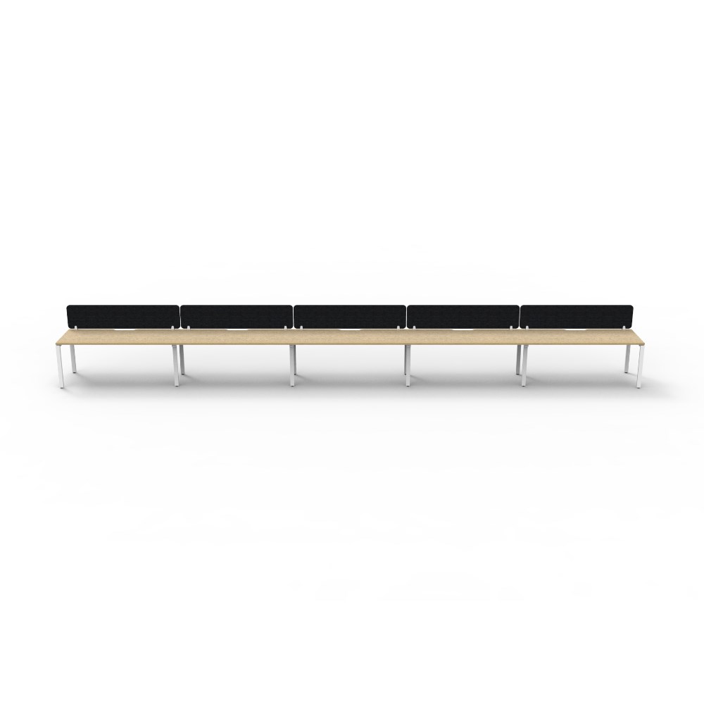 • 5 person single sided workstation with Natural Oak top and White Satin frame, Black Eco screen.