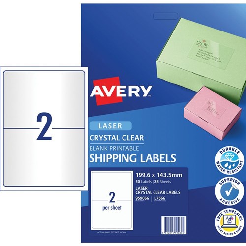 Avery Crystal Clear Laser Shipping Labels White L7566 199.6x143.5mm 2UP 50 Labels