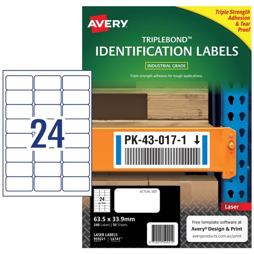 Avery TripleBond Laser Labels Identification White L6141 63.5x33.9mm 24UP 240 Labels