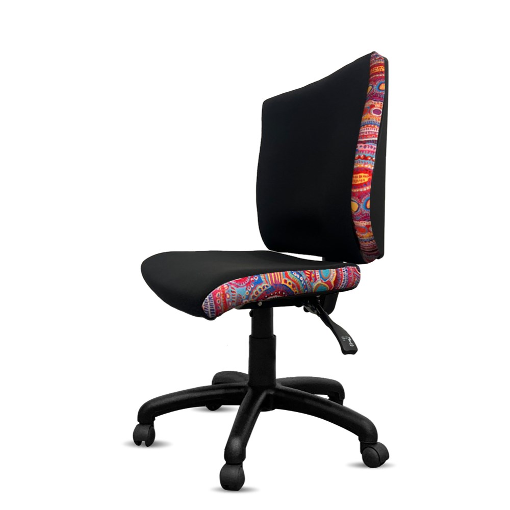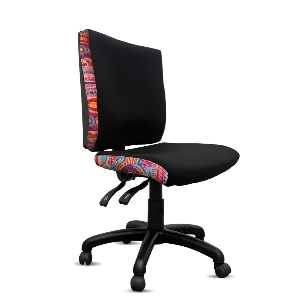 • A unique commercial fabrics designed by Murdie Nampijinpa Morris (Indigenous Artist) combined with K2 Black Fabric to upholster the chair.