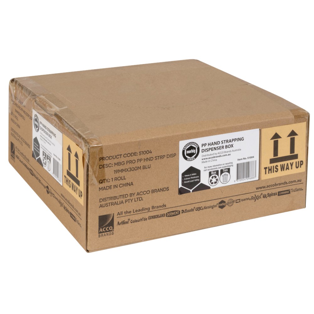 Marbig Professional Polypropylene Hand Strapping + Dispenser Box 19mmx300m Blue