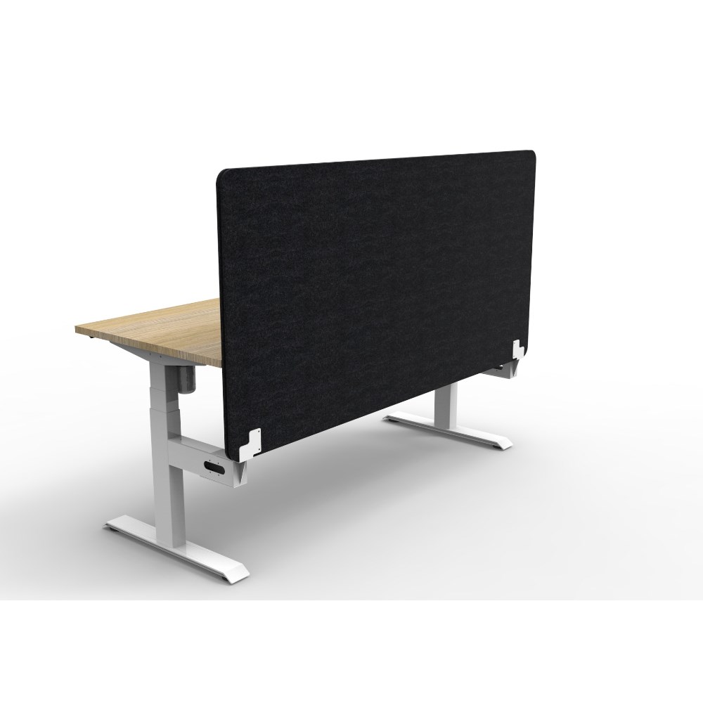 • Electric height adjustable single sided workstation with Natural Oak top and White Satin frame, Black Eco screen.