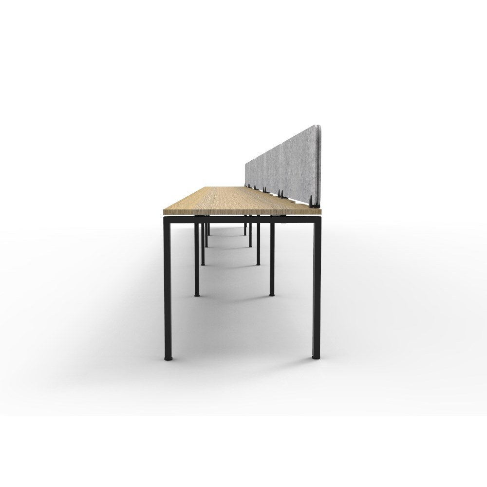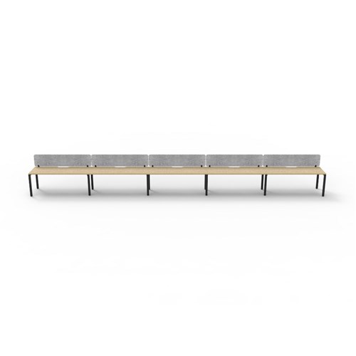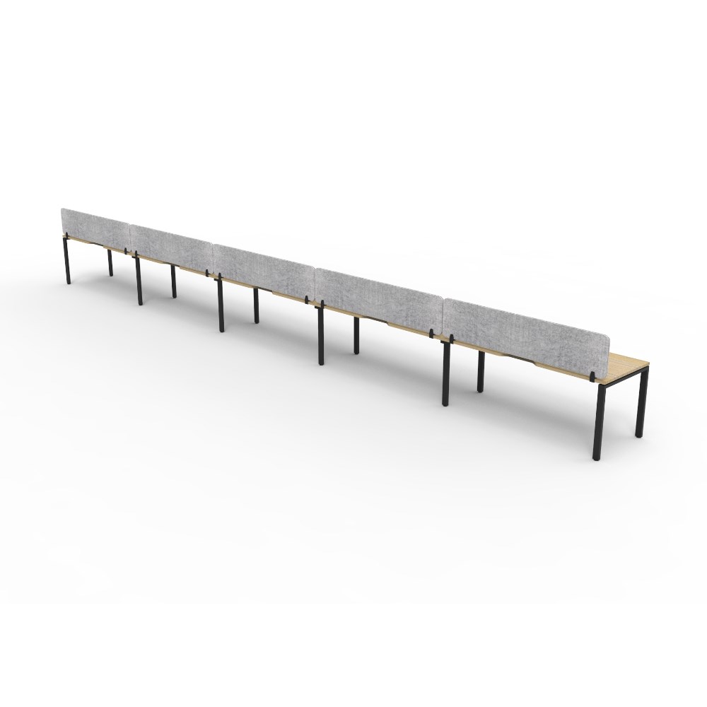 • 5 person single sided workstation with Natural Oak top and Black Satin frame, Grey Eco screen.